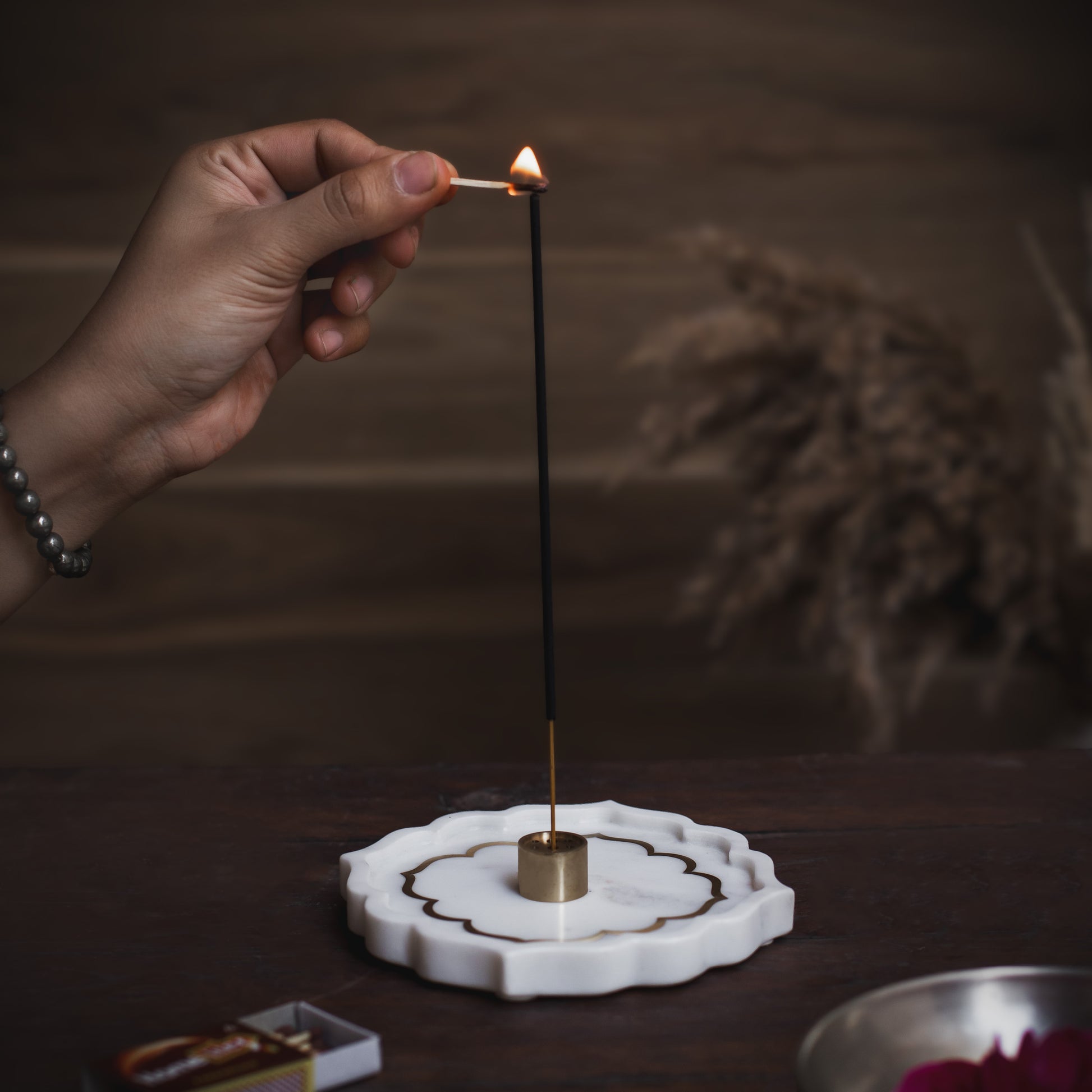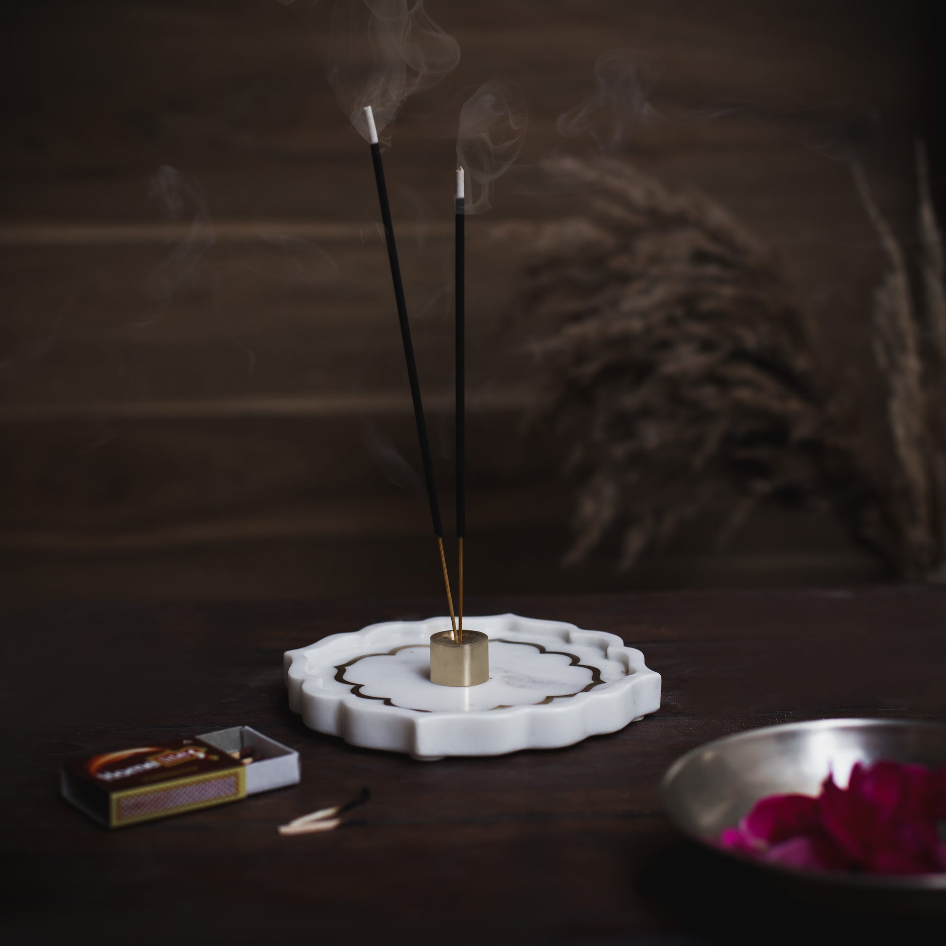 Crafted from premium marble, our incense holder features a stunning tray with intricate brass inlay, measuring a convenient 5.5 inches to effortlessly capture ash. The removable, free-standing brass incense holder adds versatility, allowing you to use this piece in multiple ways. Not only does it serve as an elegant focal point for your decor, but the tray can also double as a stylish catch-all for keys, prasadam, or other small items. Elevate your space with this beautiful blend of function and sophistication.